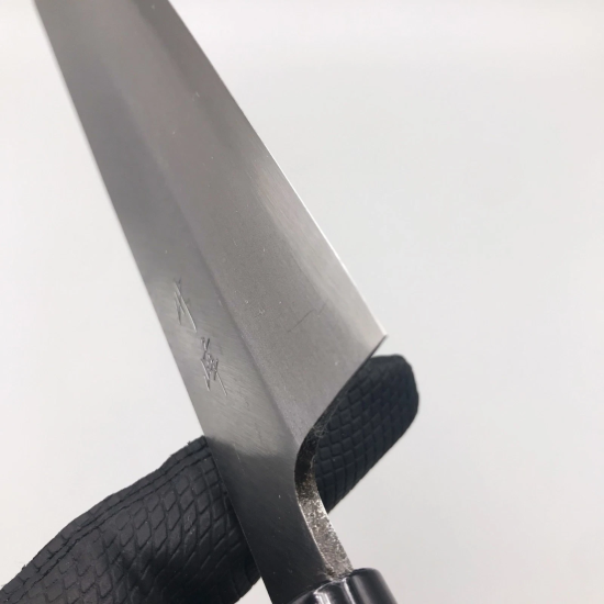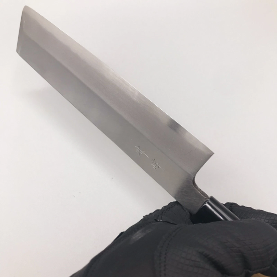 This is a Usuba knife made by Takeuchi, located in Mino City, which neighbors Seki City, Gifu Prefecture—one of Japan's leading cutlery production areas. The blade has a Kasumi construction of SK carbon steel and soft iron. In addition, this knife has a few minor scratches but shows almost no wear. If it was used at all, it was likely only a few times.