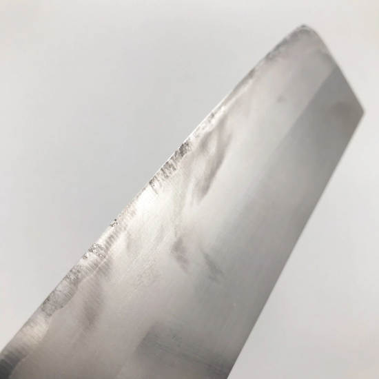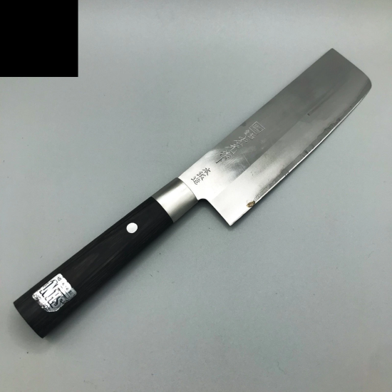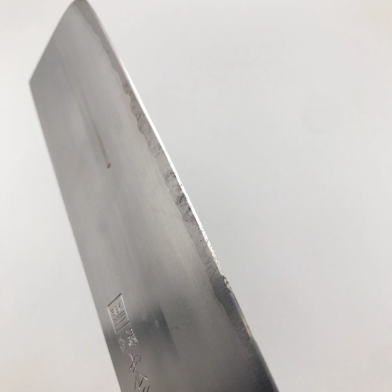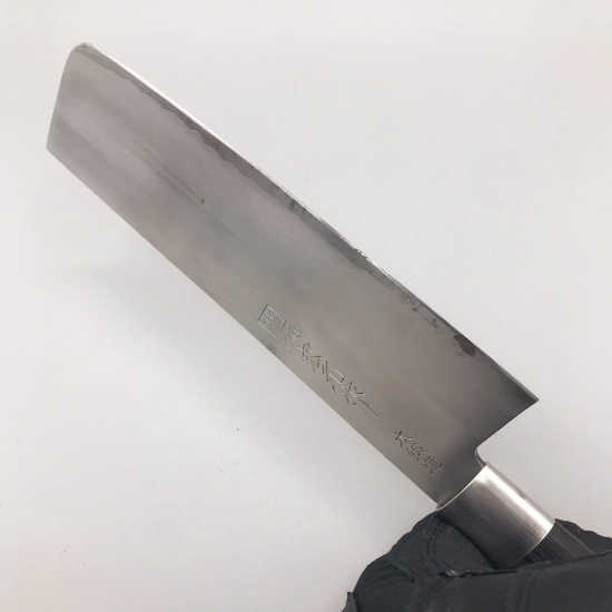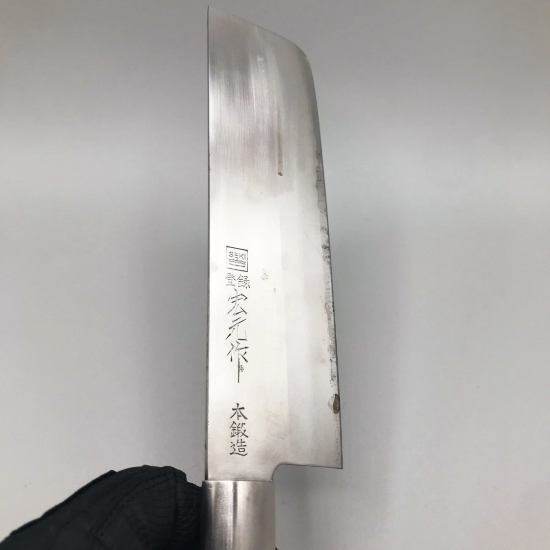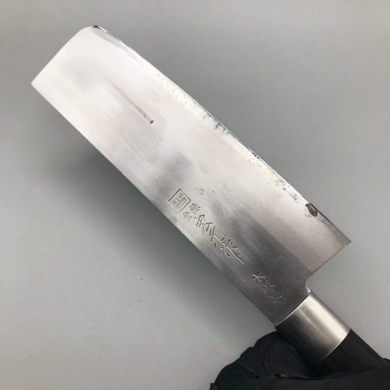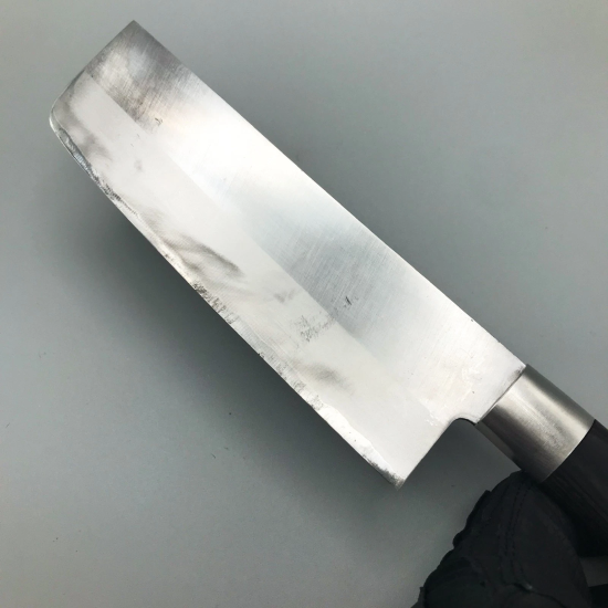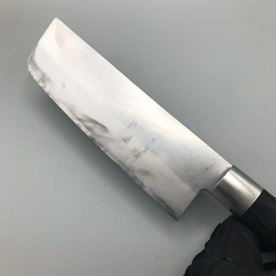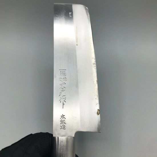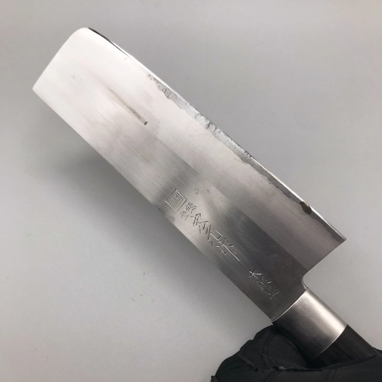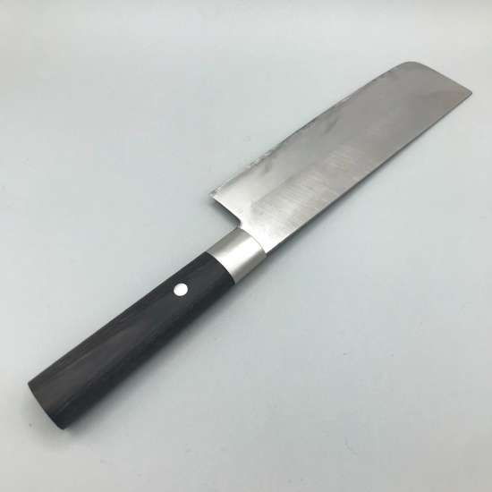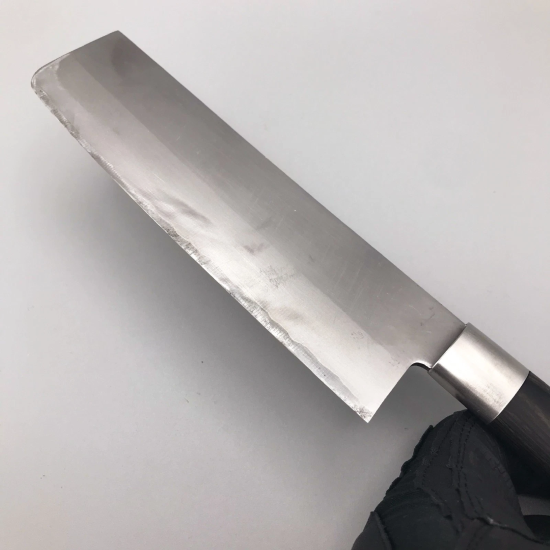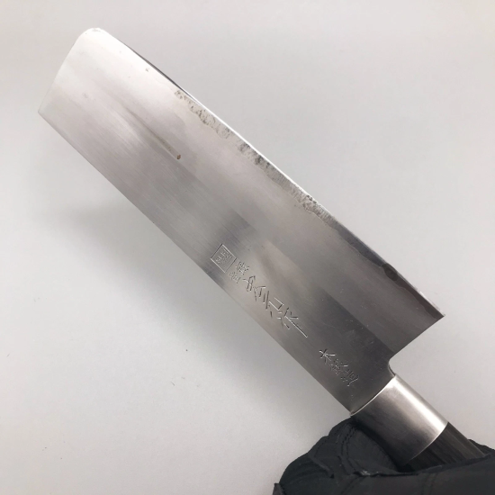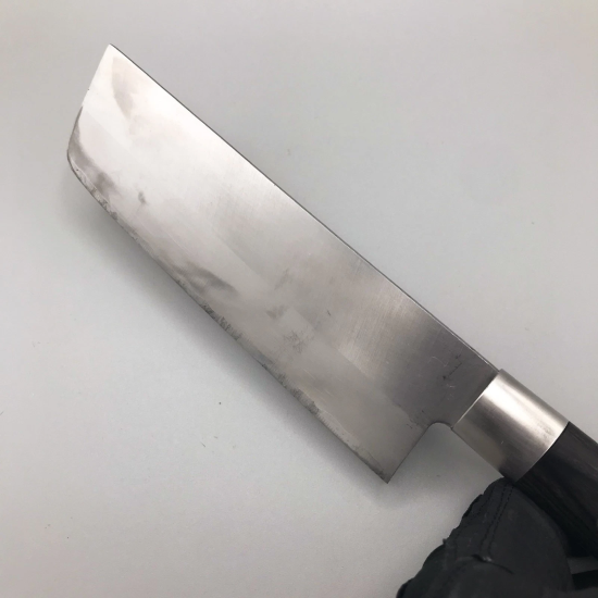 This is a Nakiri knife with a three-layer construction, featuring a carbon steel core clad with stainless steel, called “Hiromoto,” manufactured by Nagao, which was very popular among Japanese knife enthusiasts where I live.