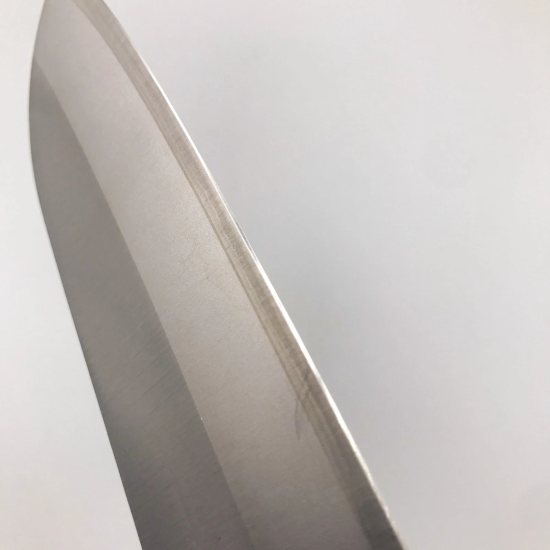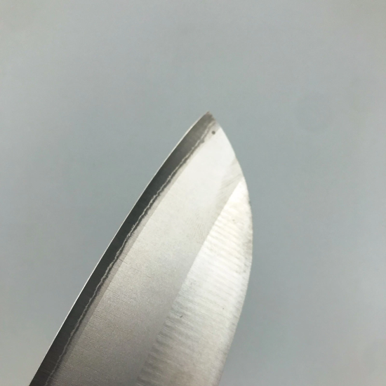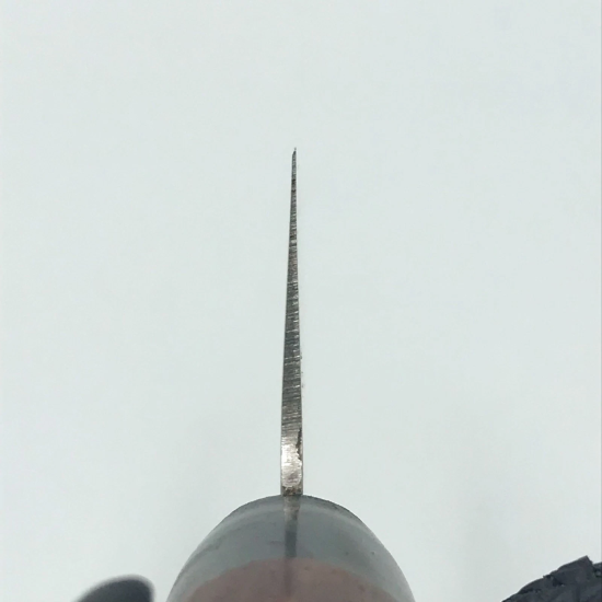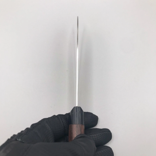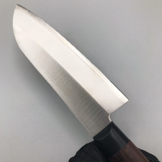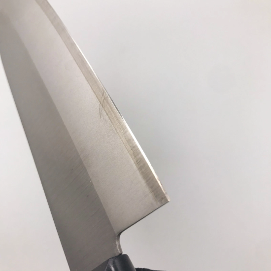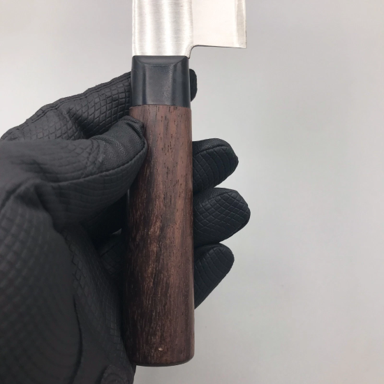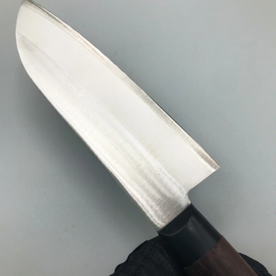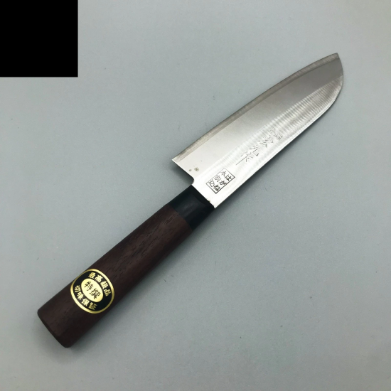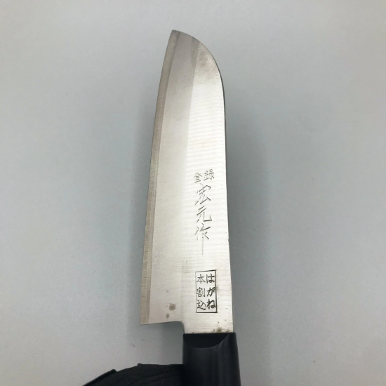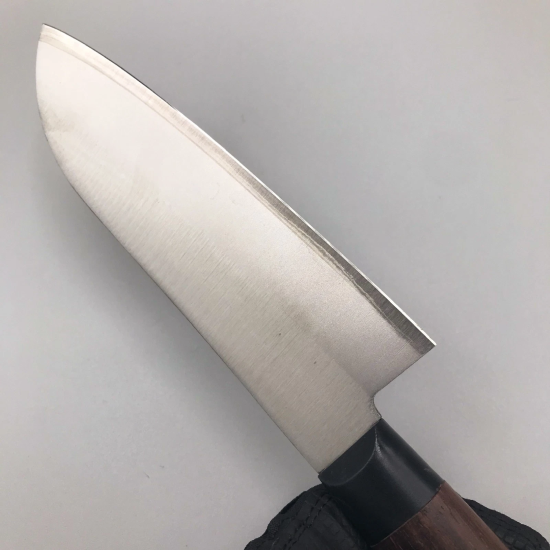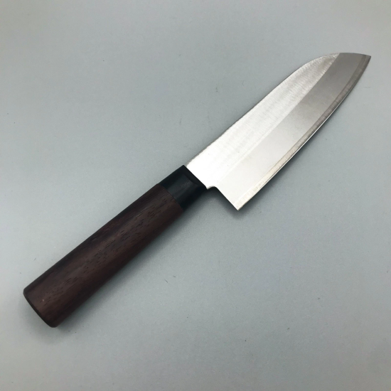 This is a small Santoku knife called “Hiromoto,” manufactured by Nagao, which was very popular among Japanese knife enthusiasts where I live. The core steel is SK carbon steel with a hardness of HRC 60.