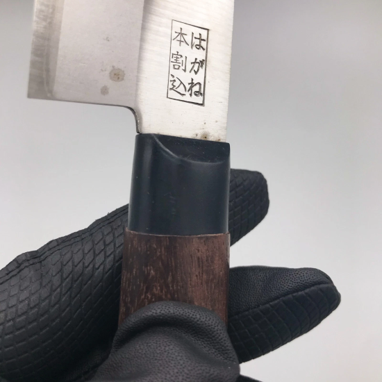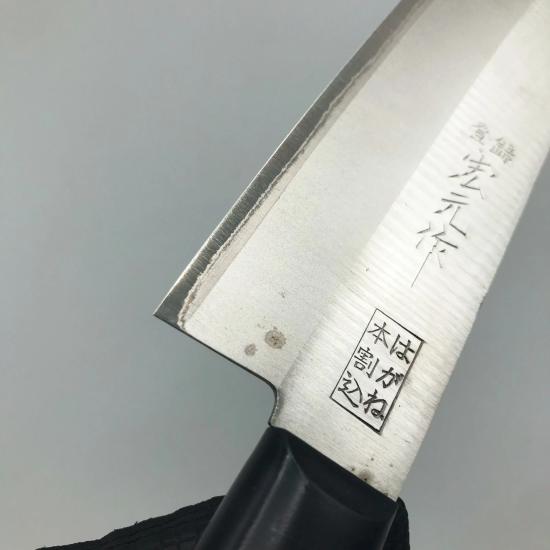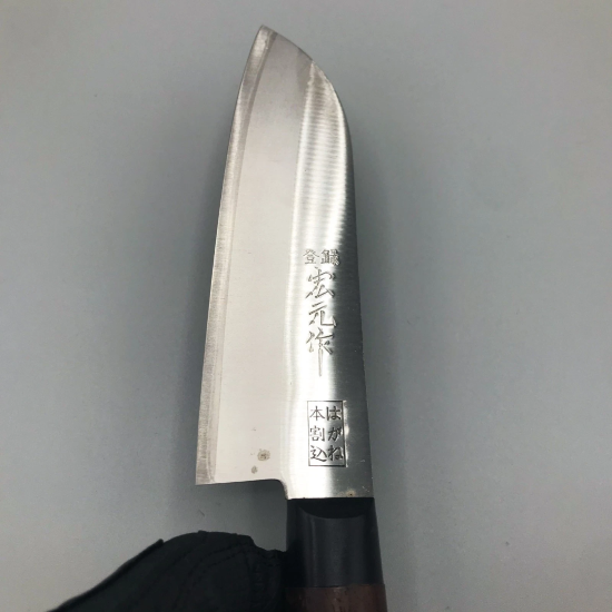 On the left side of the blade, there are Japanese characters meaning “Registered,” “Hiromoto Saku (made by Hiromoto),” “Hagane,” and “Hon-Warikomi.” While “Hagane” literally translates to “steel,” when engraved on Japanese knives it specifically refers to carbon steel. “Hon-Warikomi” means a three-layer construction.