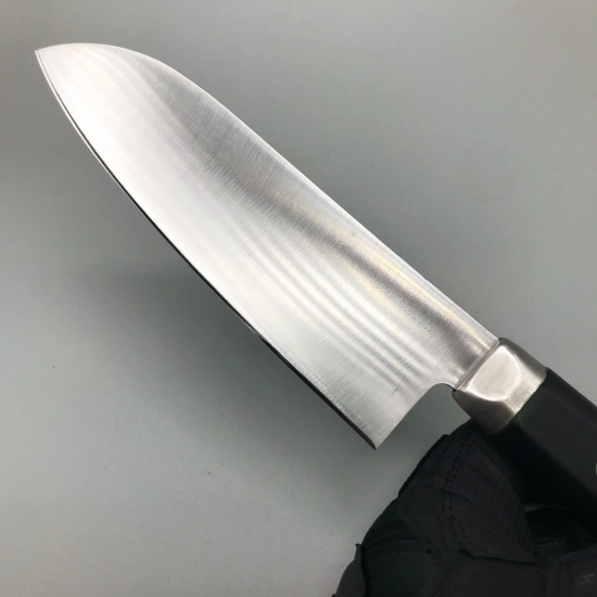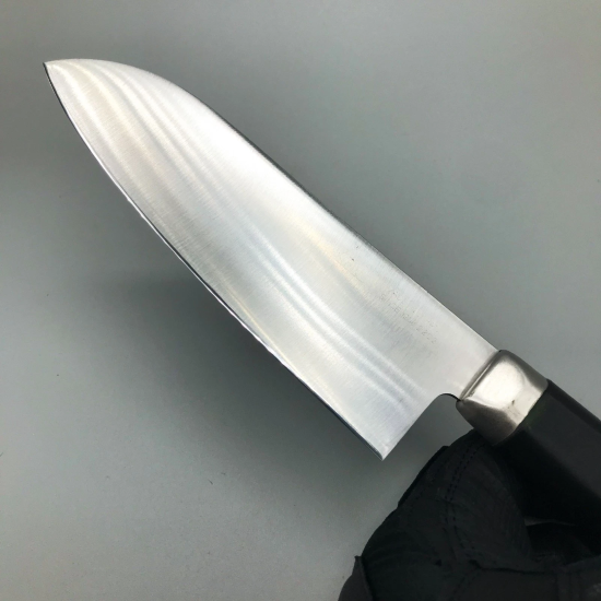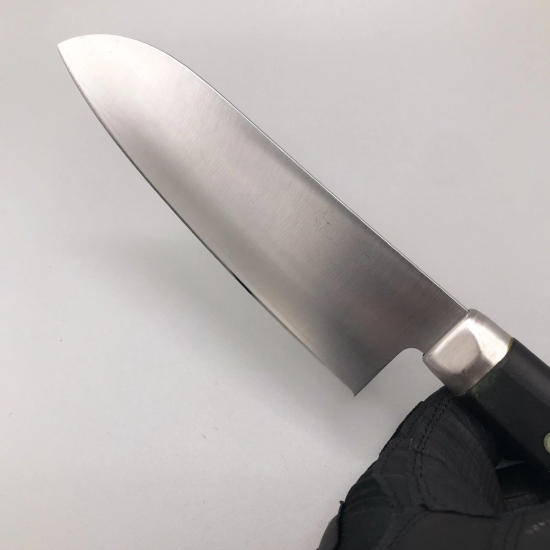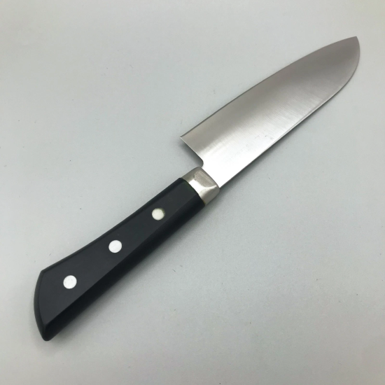 This is a small Santoku knife made by KAI, the company known for its Shun and Seki Magoroku series. The blade is made of stainless steel, and the handle is made of resin.