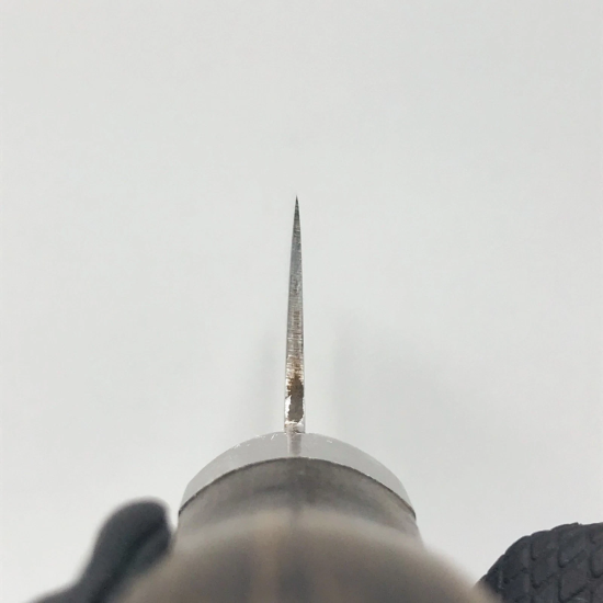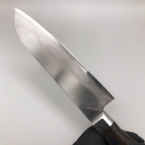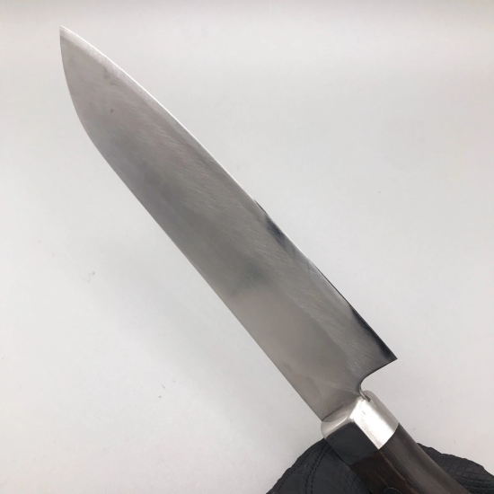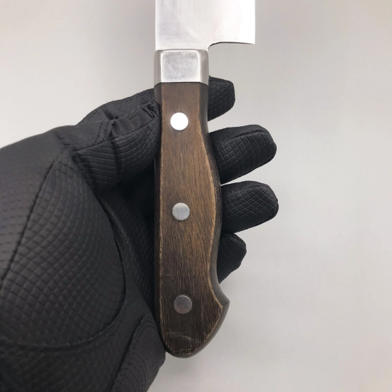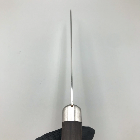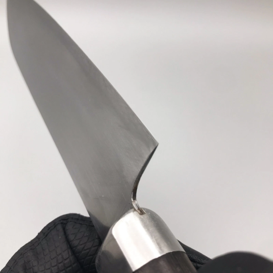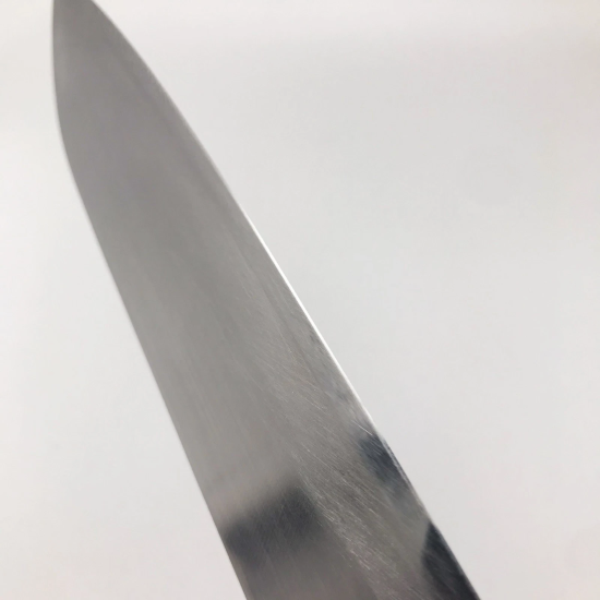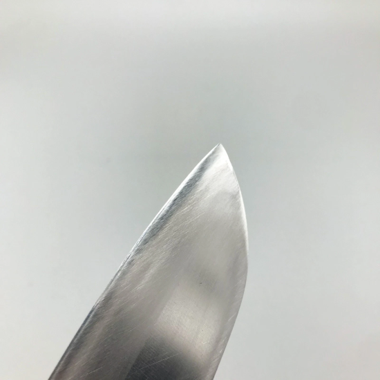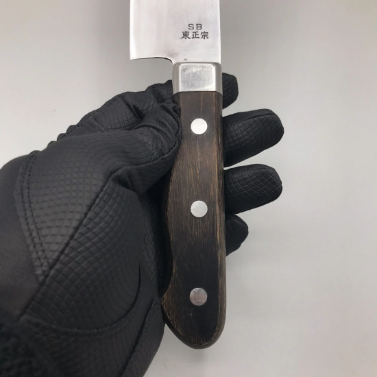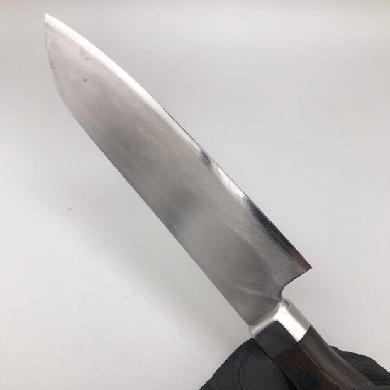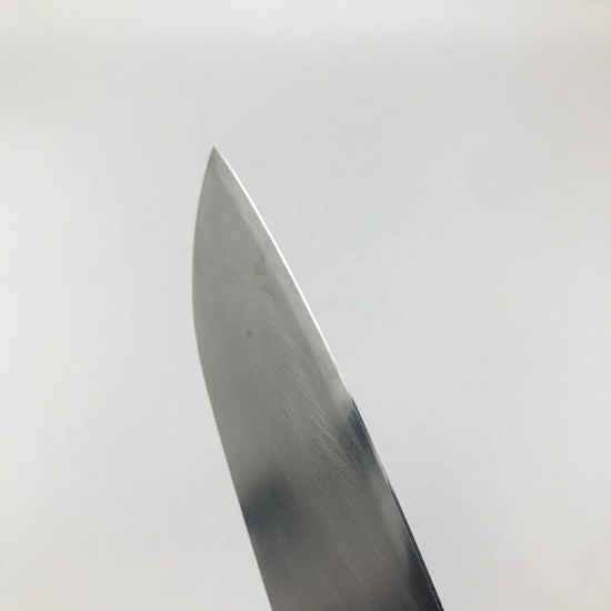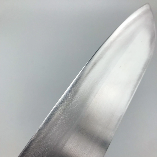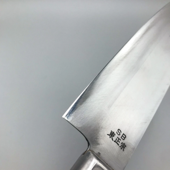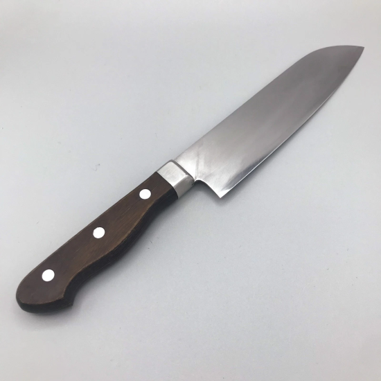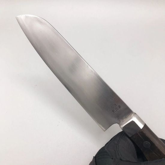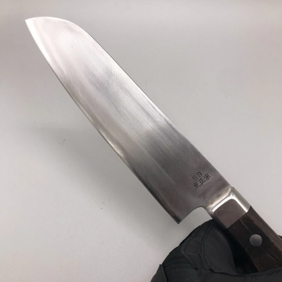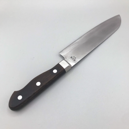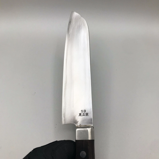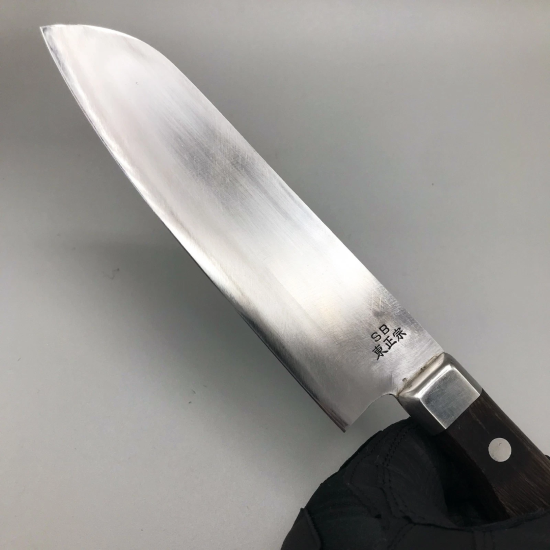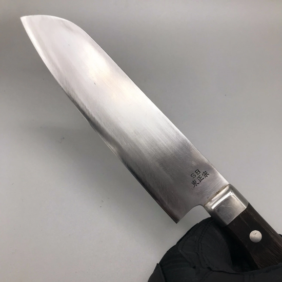 This is a very old stainless steel Santoku knife. On the left side of the blade, the name “Azuma Masamune” is engraved, but since Azuma Masamune went out of business several decades ago, both information about them and details of the steel used for this knife are unknown.