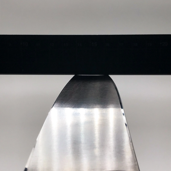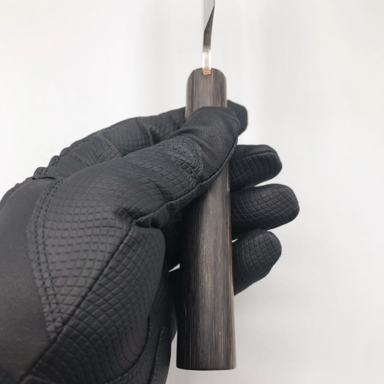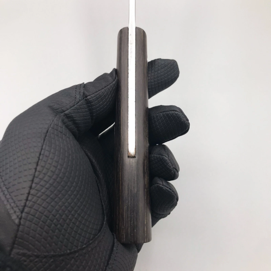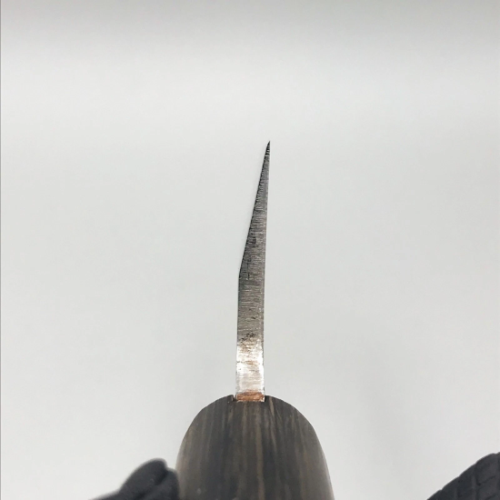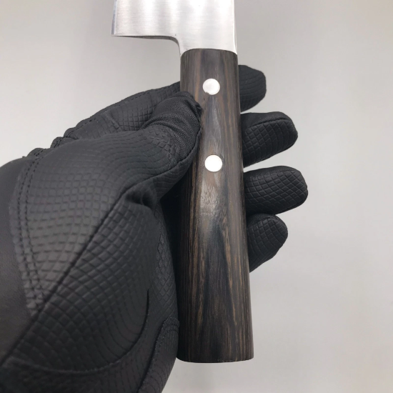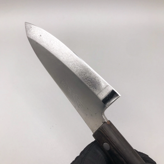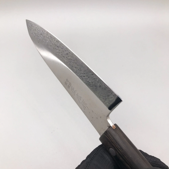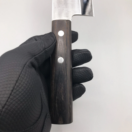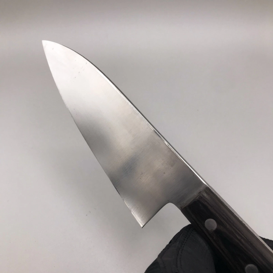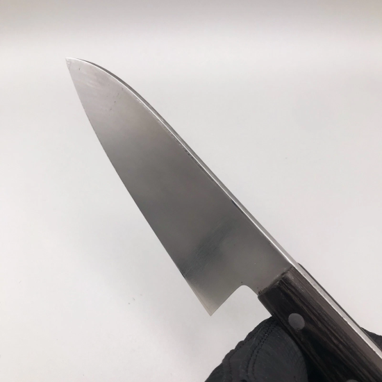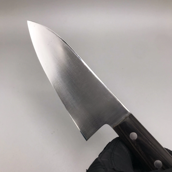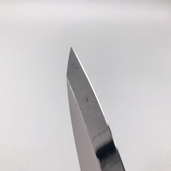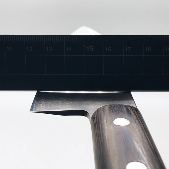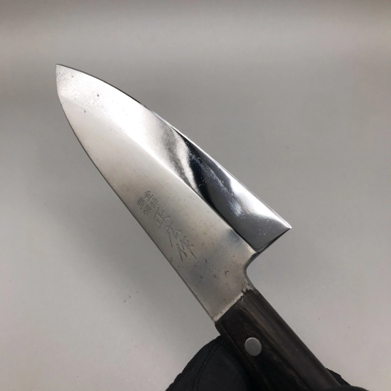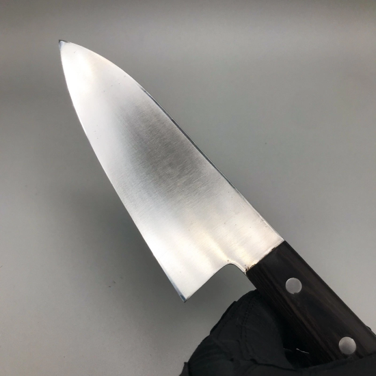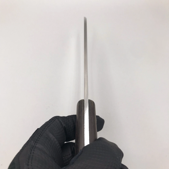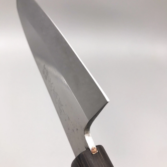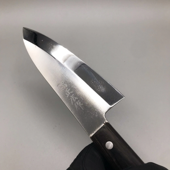 This knife was sharpened by the previous owner, not by me. Japanese single-bevel knives are generally finished with a two-step edge by adding a micro bevel (a very small secondary bevel at the edge). This knife has a two-step edge with a relatively large micro bevel. Personally, I find this micro bevel a bit too large, but a larger micro bevel makes the blade less prone to chipping. Therefore, this knife can be a good option for someone who wants a Deba that is ready to cut upon arrival and also emphasizes chip resistance.