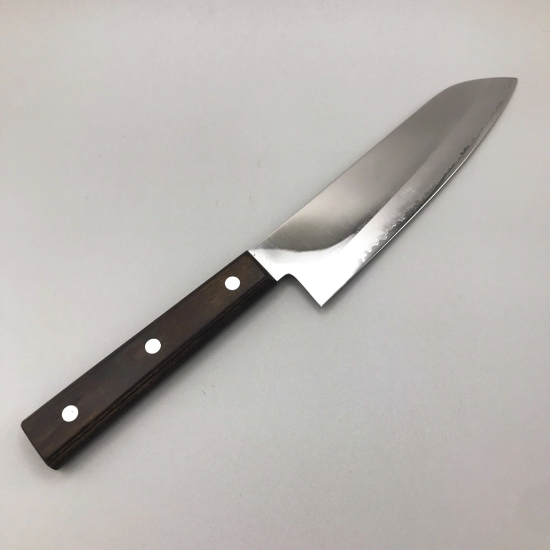 This is likely a three-layer Santoku knife made with a rare type of steel called ChromaX, sandwiched between stainless steel.