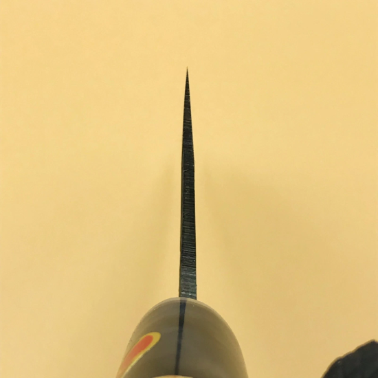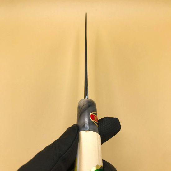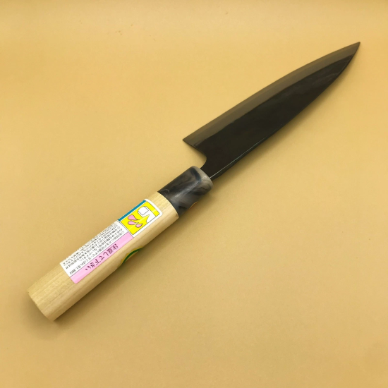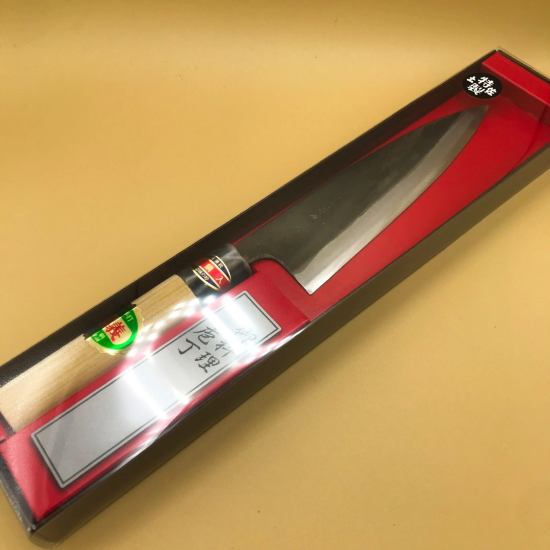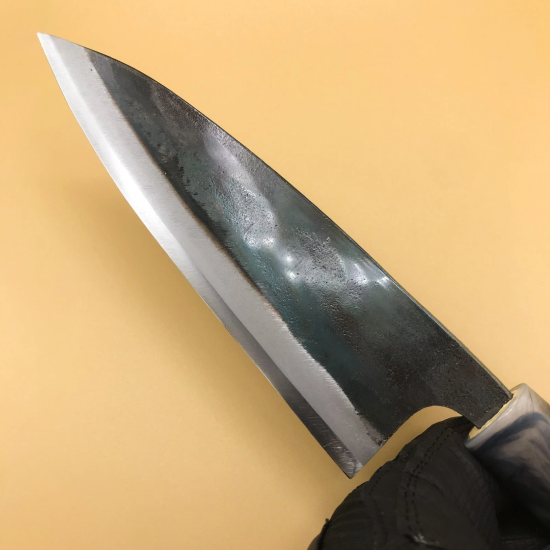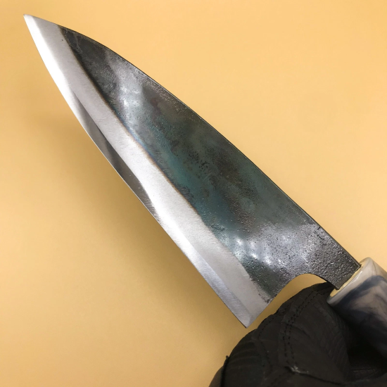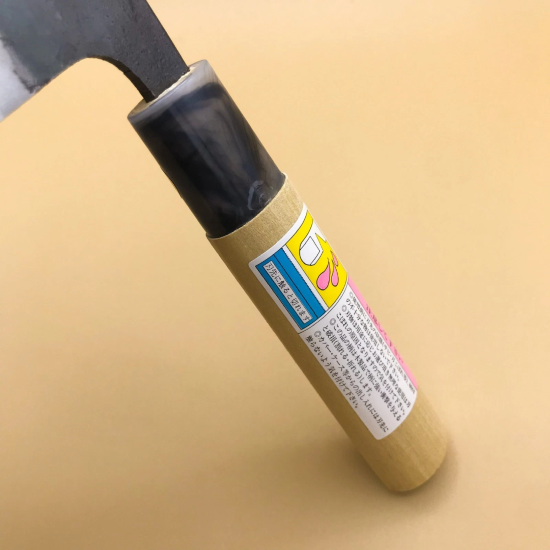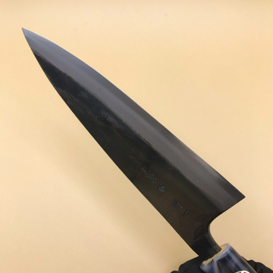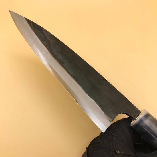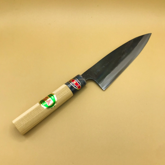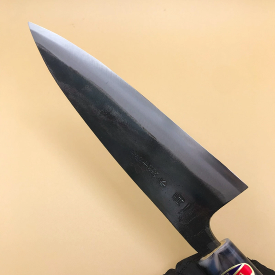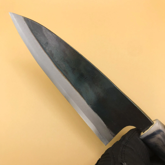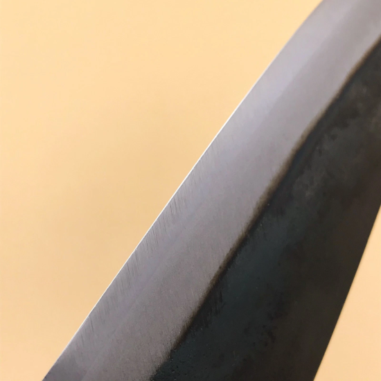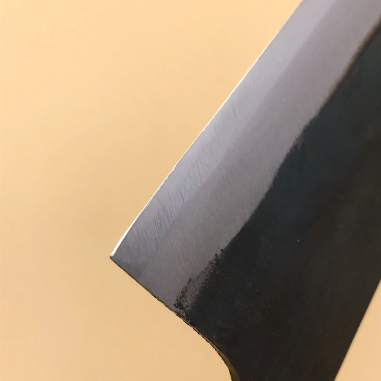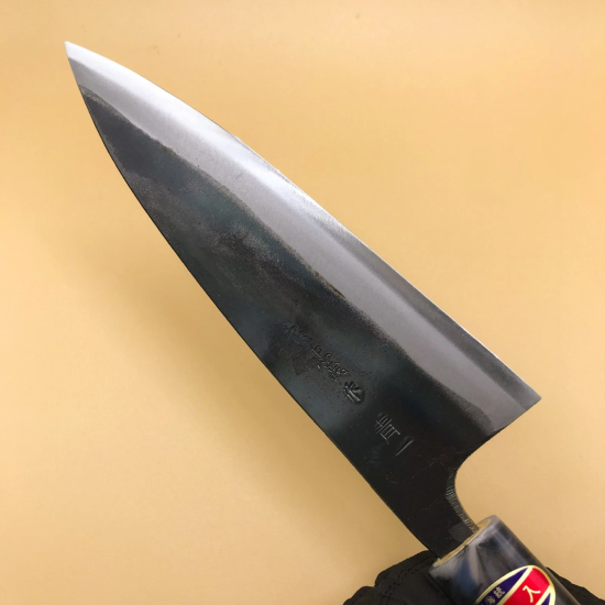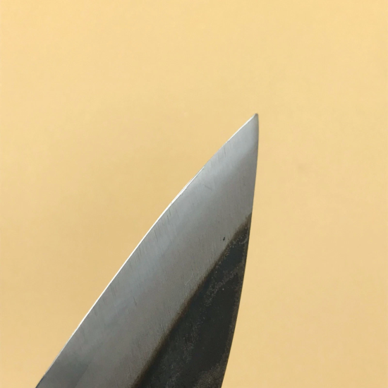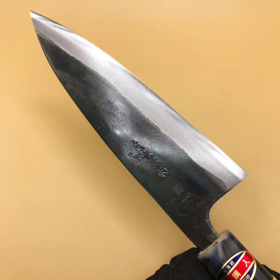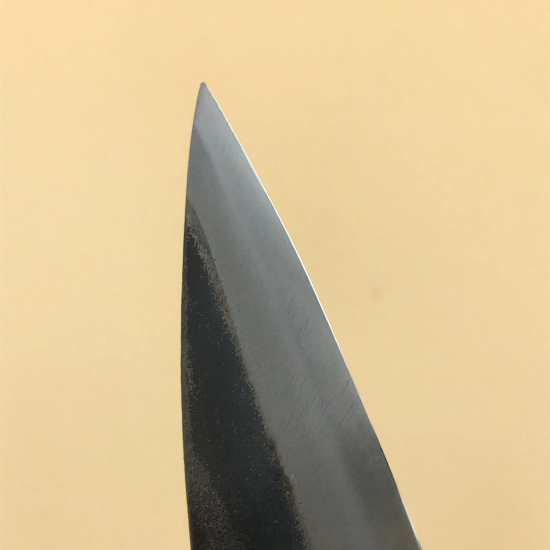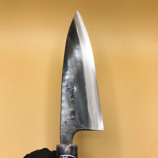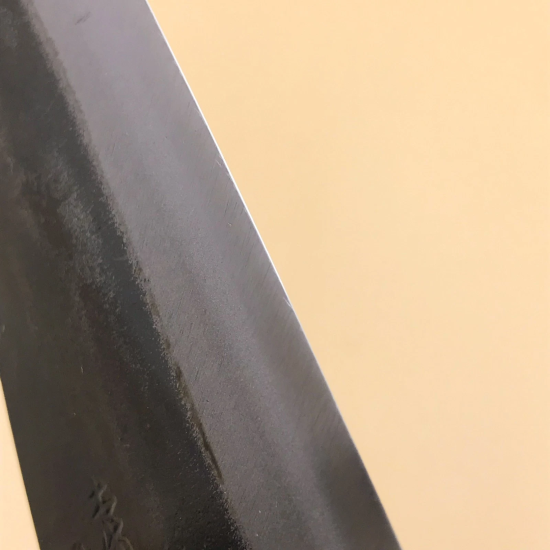 This is a Santoku knife made in Kochi Prefecture (Tosa region), one of Japan’s leading cutlery production areas. The core is Blue #1 carbon steel, and the sides are soft iron, so the whole knife is prone to rust.