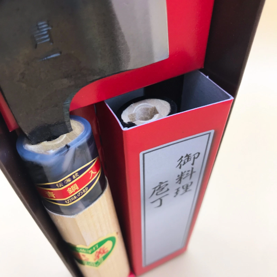 The sticker on the ferrule reads “Blue carbon steel, traditional craftsmanship,” and the sticker on the handle reads “Tosa, hand-forged, Tadayoshi.”